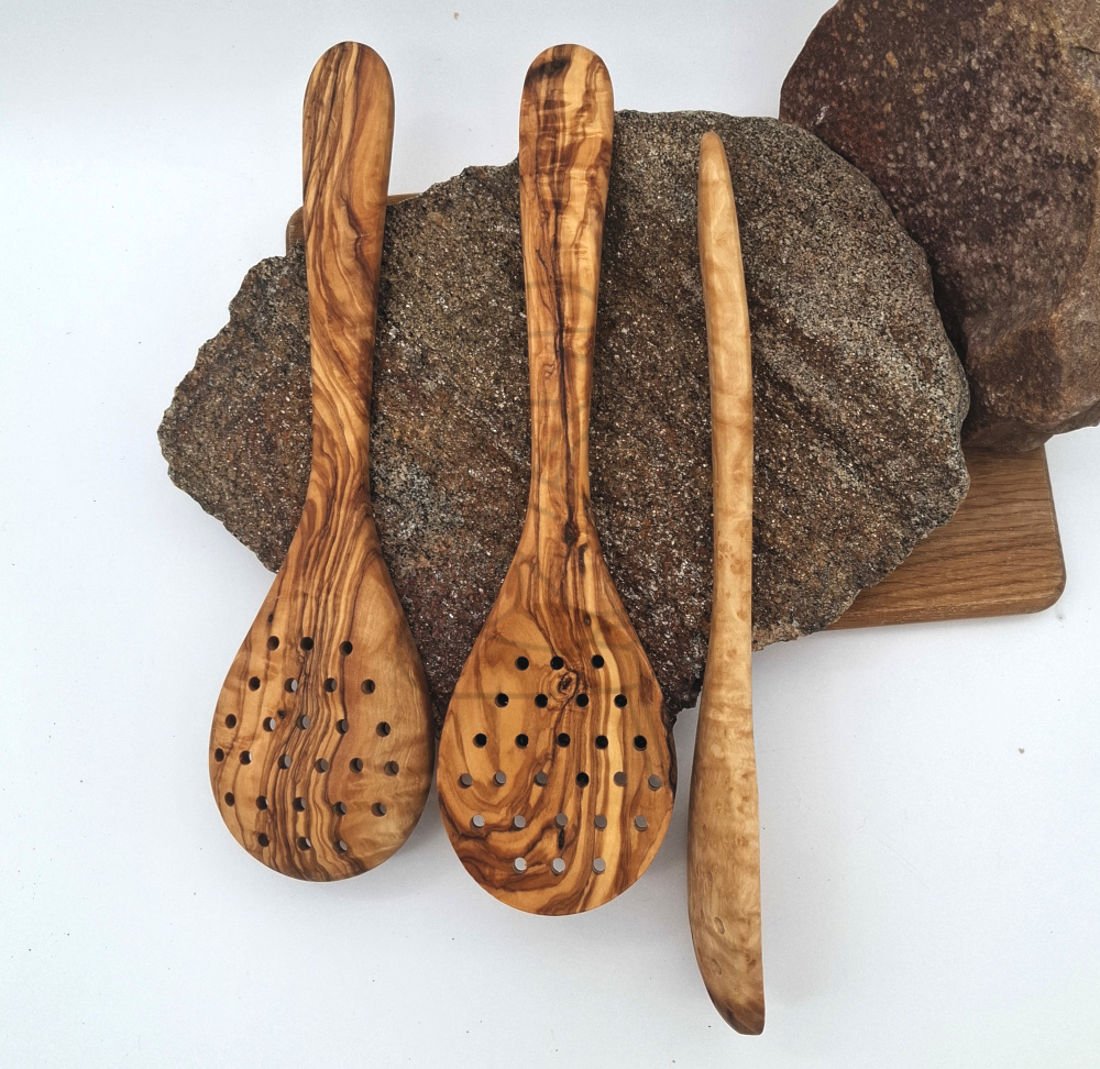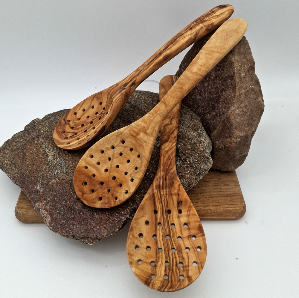 Håndlavet af ægte oliventræ fra Middelhavet. Den robuste design med huller gør den perfekt til at løfte mad ud af gryden eller til at silte små ingredienser med stil.
