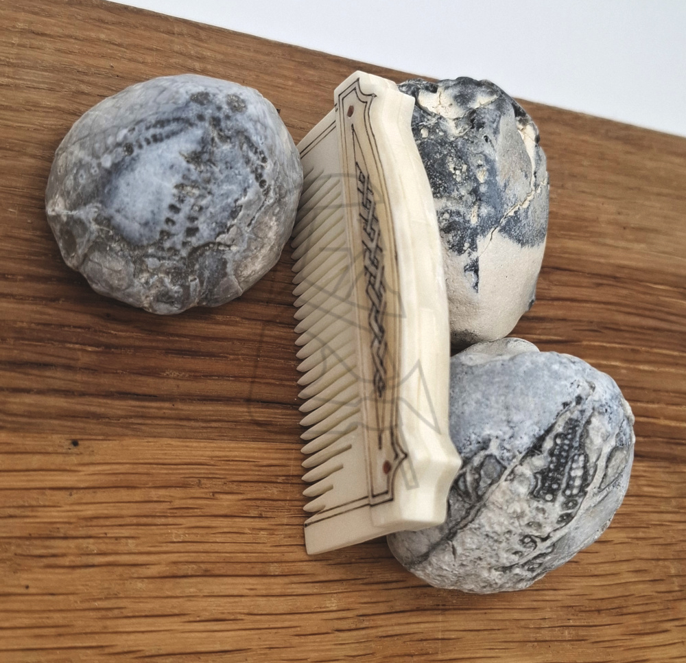 This beautiful decorated bone comb, measuring 4 cm in height and 8.5 cm in width, is a unique piece of craftsmanship that blends functionality with aesthetics. Crafted from natural bone, the comb exhibits distinctive characteristics that set it apart from modern materials. The finely carved ornamentation – featuring intricate patterns and delicate reliefs – lends each comb a personal charm, transforming it into a decorative masterpiece, with colors ranging from warm white to light yellowish-brown hues. The natural strength and smooth surface of bone make it ideal for beard care, gliding effortlessly through thicker beard hair without snagging, while its lightweight nature adds comfort. As a sustainable material sourced from agricultural byproducts, this beard comb not only offers practical use but also brings a historical and artistic dimension to daily life.